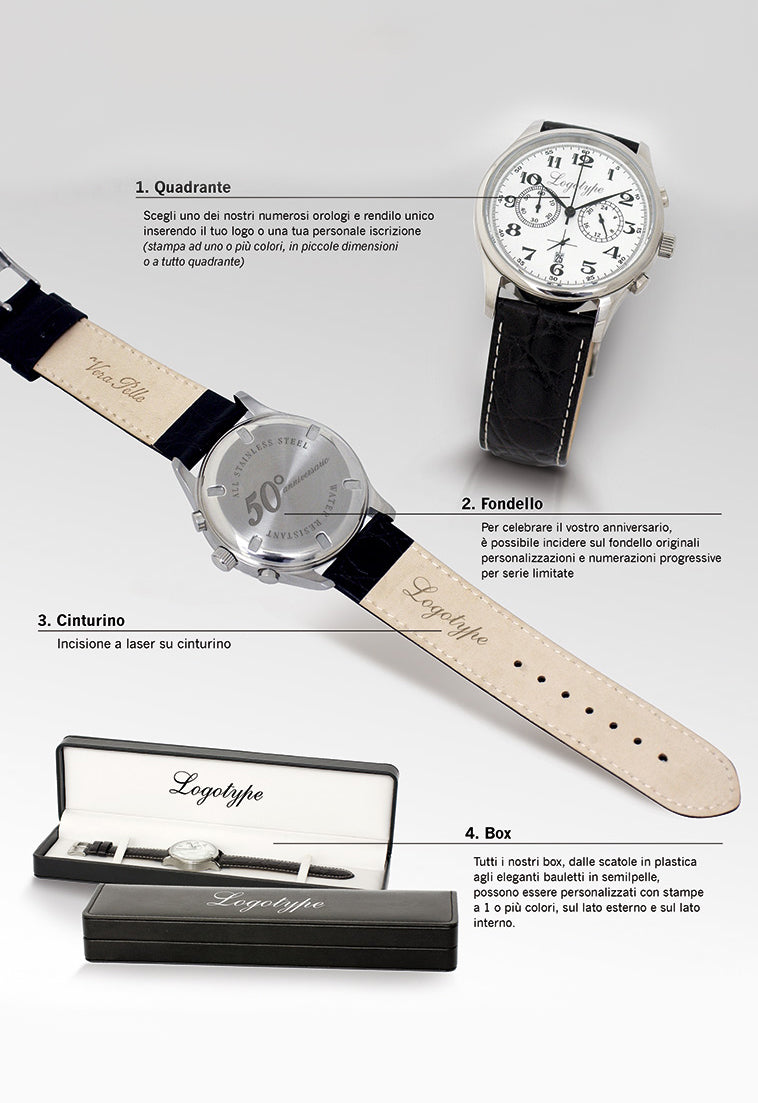 Gracias a nuestros relojes de calidad, somos un punto de referencia para quienes buscan una empresa de fabricación de relojes por cuenta de terceros en Italia y en el extranjero. Ofrecemos asistencia para el diseño y creación de gadgets corporativos, kits de bienvenida y material promocional, creando a nuestros clientes colecciones de relojes exclusivas capaces de reflejar su imagen y representar de forma incisiva su estilo.